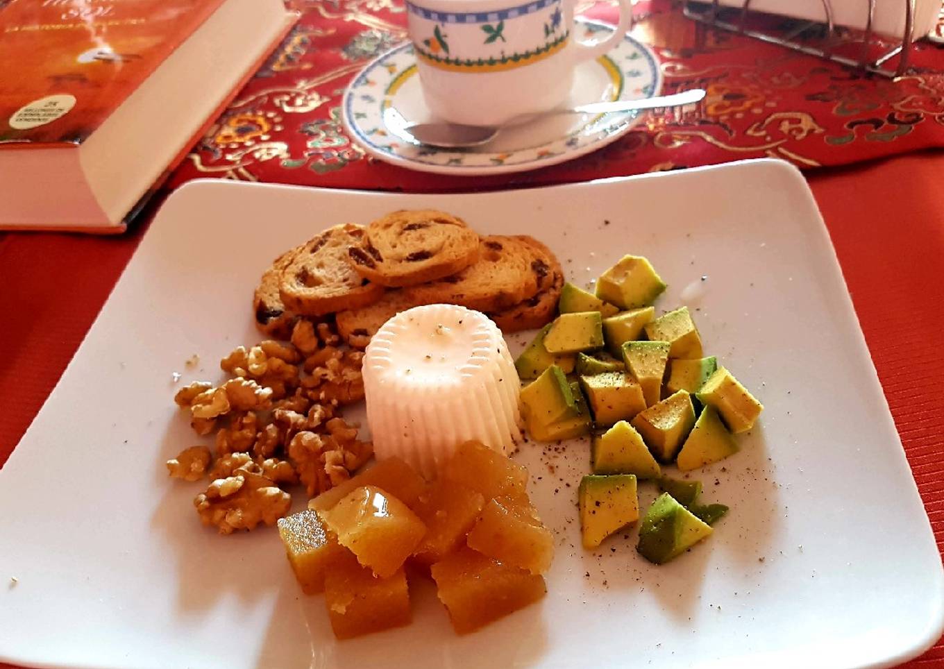 - Partir las nueces, cortar el membrillo en dados, cortar el aguacate en trozos. Preparar la infusión o café.