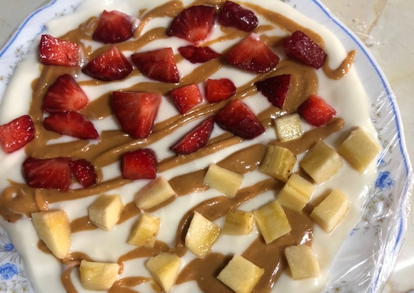 - Echamos el yogurt griego y lo expandimos con una cuchara, después le echamos la crema de cacahuete por encima.
