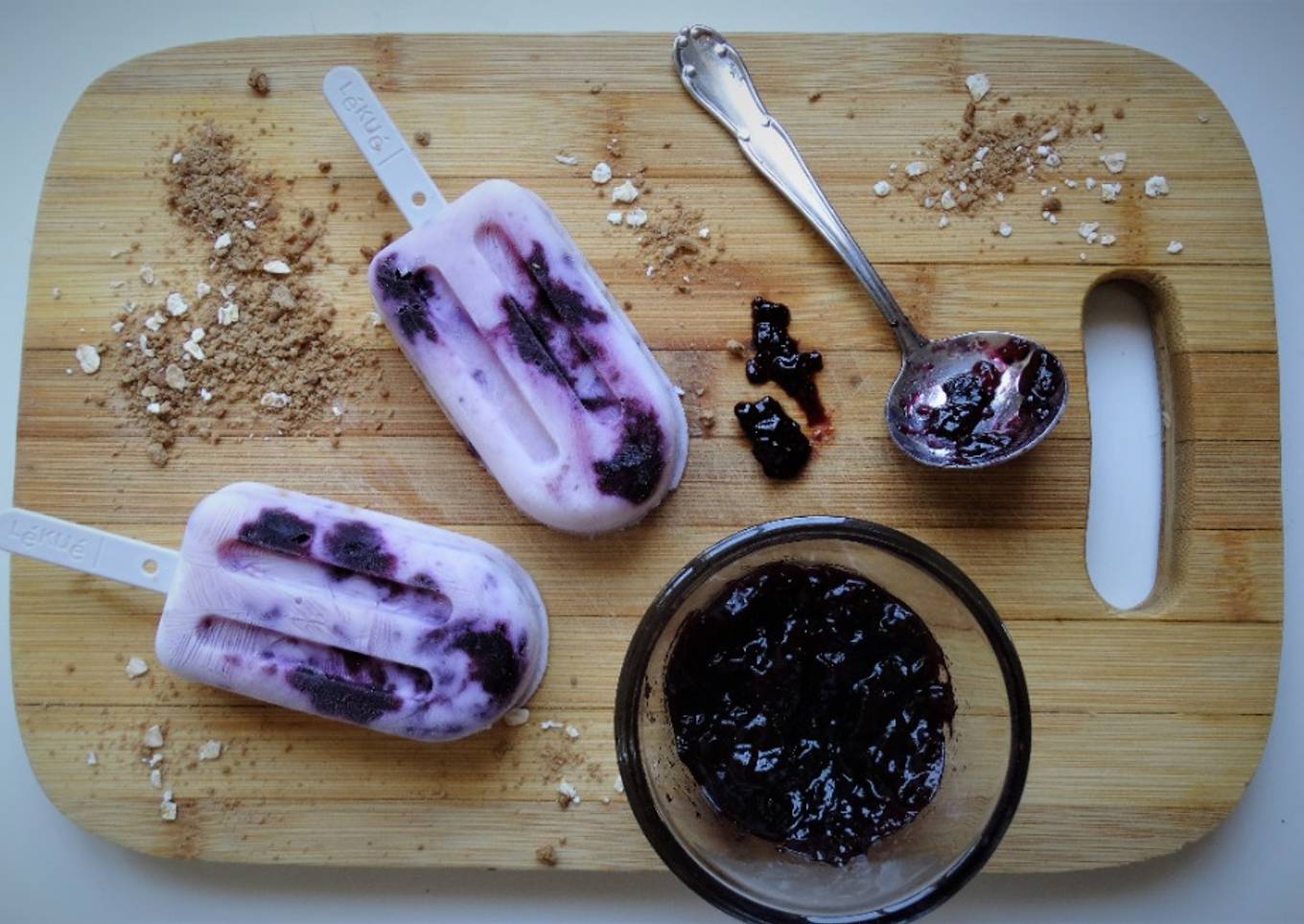 - Preparamos los moldes. Yo he utilizado los moldes para helados de lekué que son muy fáciles de desmoldar. Salpicamos un poquito de mermelada en el molde y a continuación vertemos la mezcla que habíamos preparado previamente. Cerramos los moldes y los metemos en el congelador por 2 horas. ¡Y listo! Muy ricos y saludables.