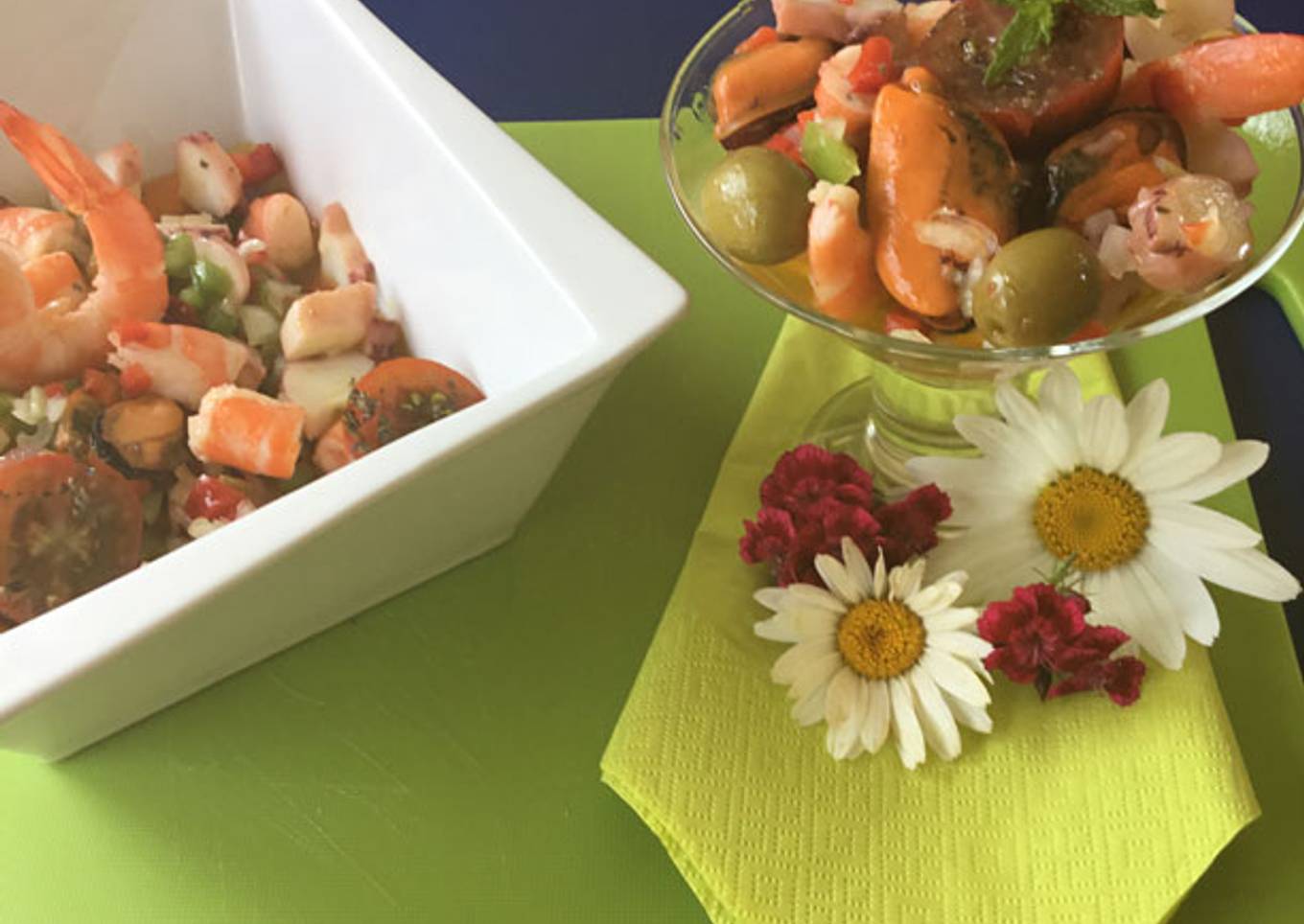 - En un bol mezclamos langostinos, pulpo, mejillones, aceitunas, picadillo y vinagreta. Removemos para integrar los sabores y dejamos reposar en la nevera unas cuantas horas. Consumir frío.