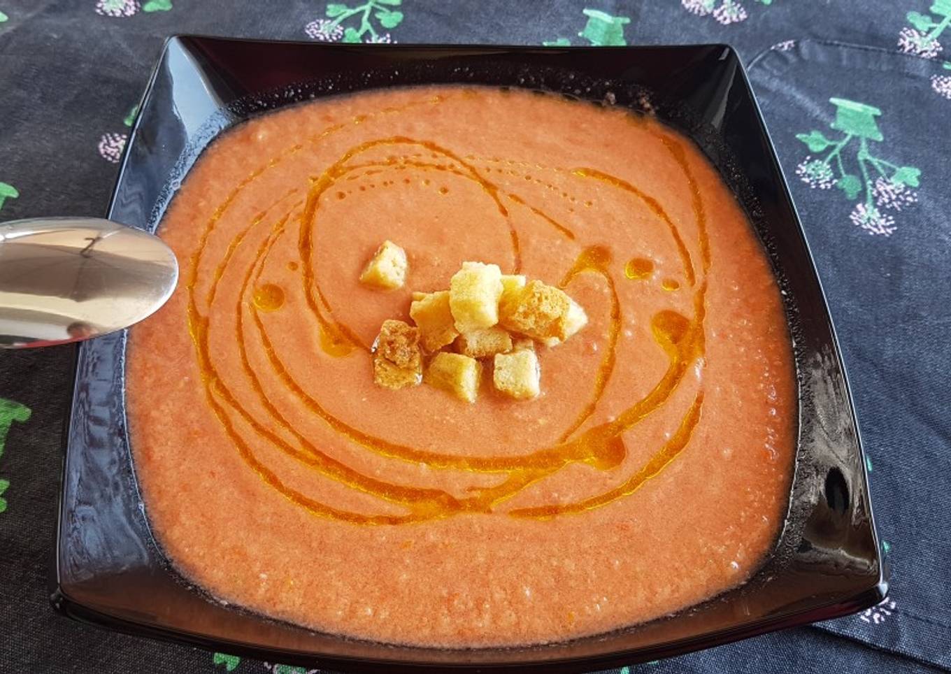 - Y ahora es ya cuestión de gusto, más espeso, más líquido podemos añadir más hielo o agua fría. Para acompañar, podéis picar cebolla, pepino, tomate, pimiento muy pequeño o bien acompañar con unos picatostes de pan. Un plato fresquito, sano y muy rico😋😋