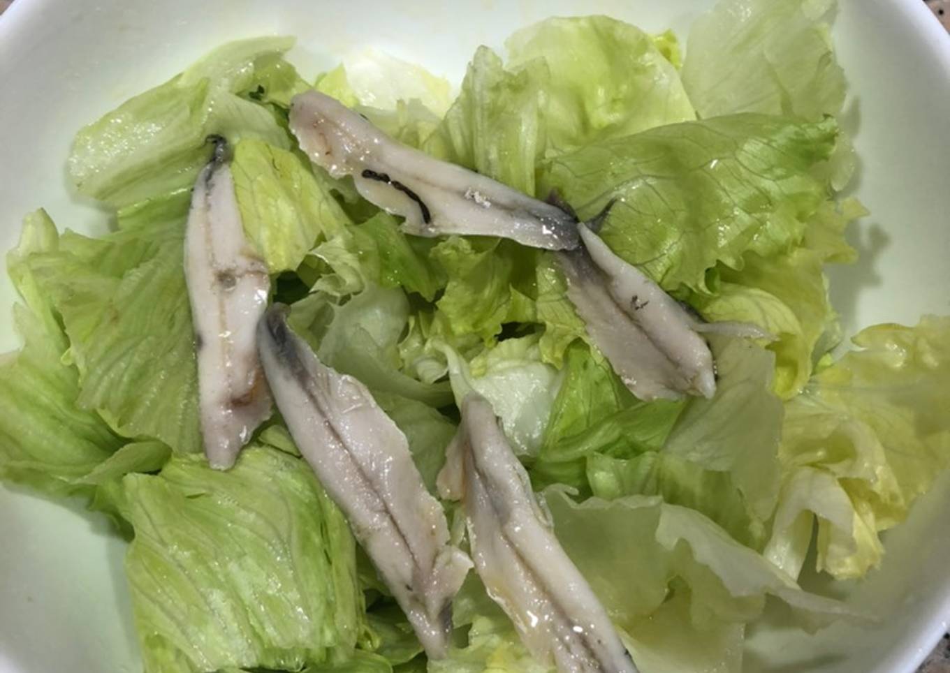 - Lavar la lechuga, partirla en trozos, echar los boquerones en vinagre con su aceite y todo, remover y servir