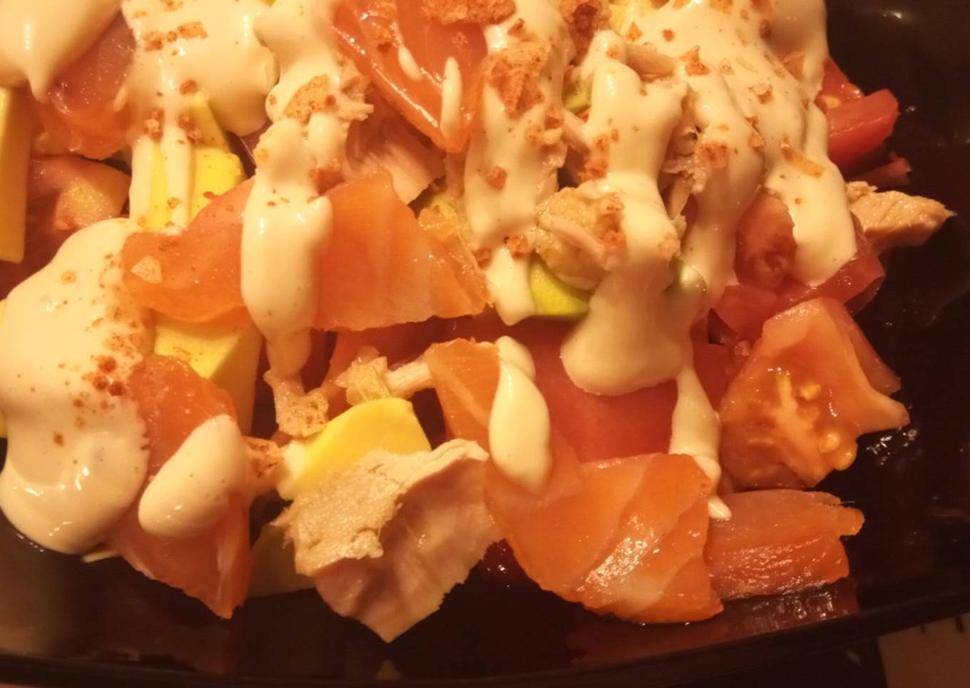 Ensalada de Tomate, Salmón Ahumado, Atún y Aguacate Mayonesa de Soja y Cristales de Sal al Pimentón